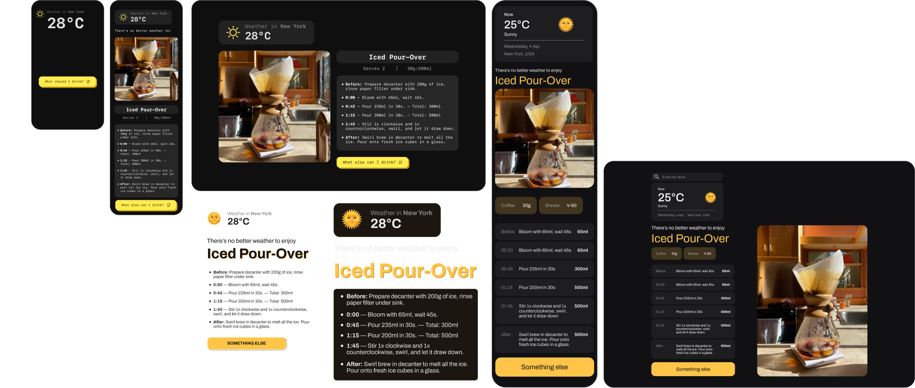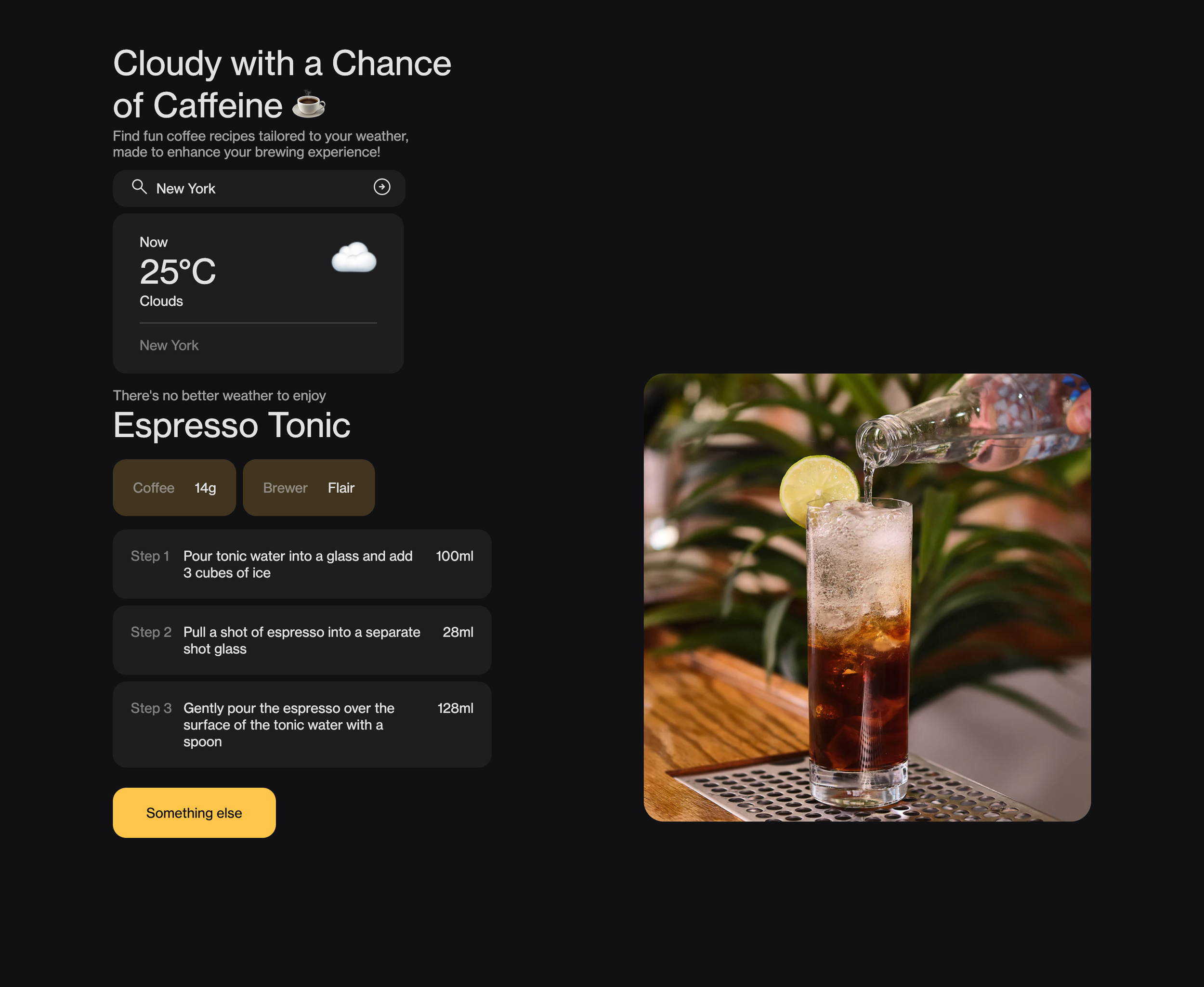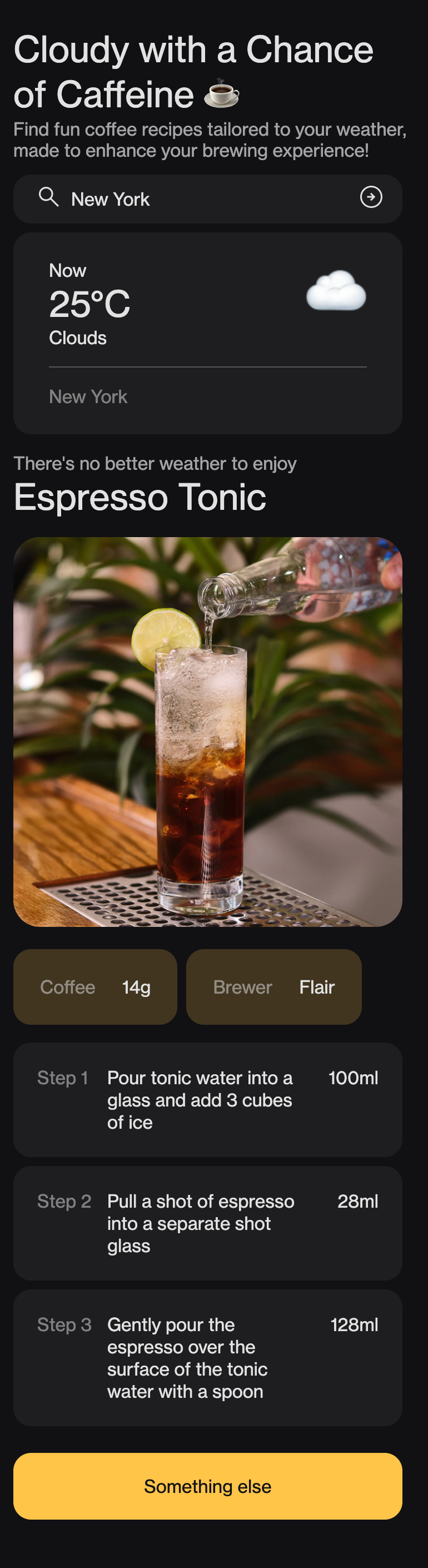 Cloudy with a Chance of Caffeine takes out the guesswork in the coffee brewing process. Once a location (city, state, country) is inputted, the website fetches its current weather and forecast and suggests an appropriate step-by-step coffee recipe for those conditions. Clicking on the “Something else” button chooses another recipe from the database while remaining appropriate to the weather condition.